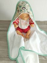 – une cape de bain de 70×70 cm (diagonale de 94 cm). En éponge de fibre de bambou blanche très douce, le dessus de la capuche est en coton certifié Oeko Tex, imprimé petits animaux sioux, l’intérieur de la capuche est en éponge.
