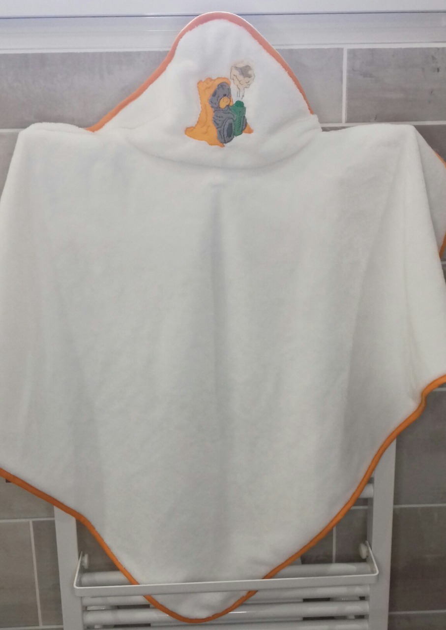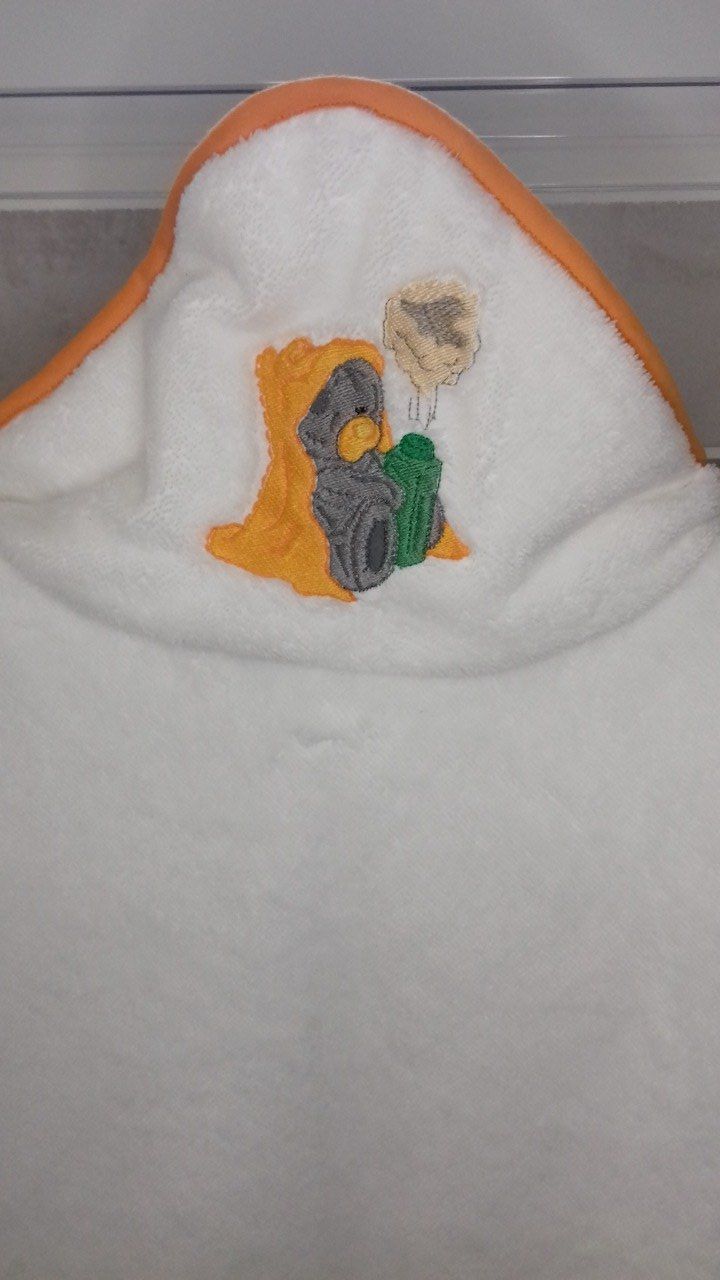 En éponge de fibre de bambou blanche très douce, le dessus de la capuche est brodé avec un petit ourson farceur qui a joué avec son flacon de talc et a créé un nuage de poussière. L’intérieur de la capuche est en éponge de bambou pour une douceur parfaite sur la tête délicate de bébé.