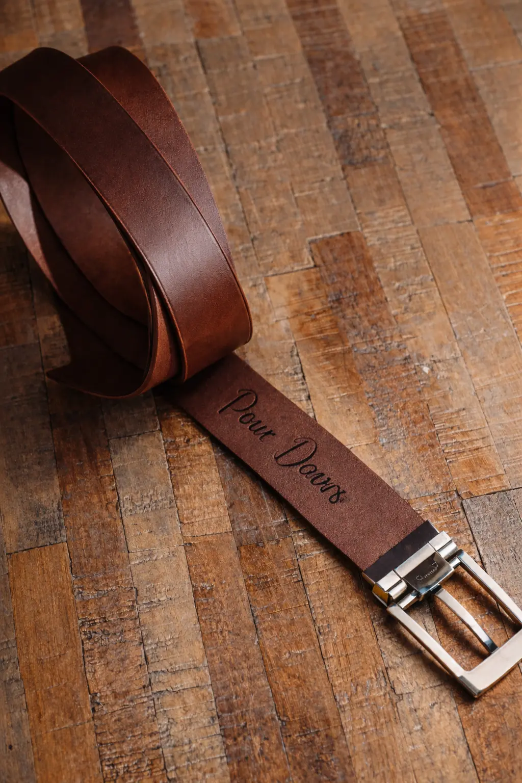Ceinture en cuir brun avec un texte gravé pour une personnalisation -Pau de Cuir-Pau-Maroquinerie artisanaleCeinture en cuir marron surpiquée personnalisée – Édition Saint-Valentin