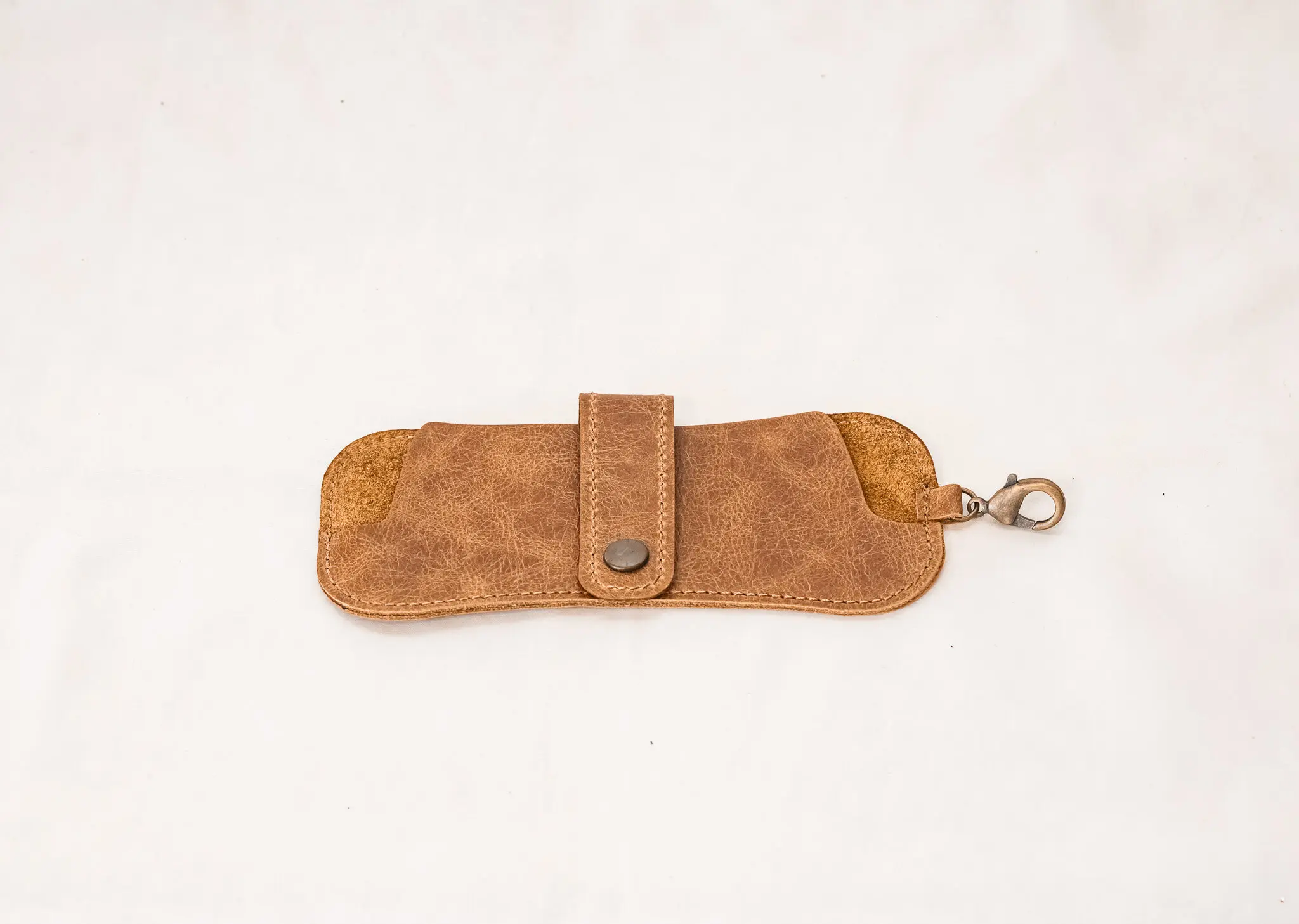 • Étui à lunettes en cuir pleine fleur, à accrocher au sac ou à la ceinture.