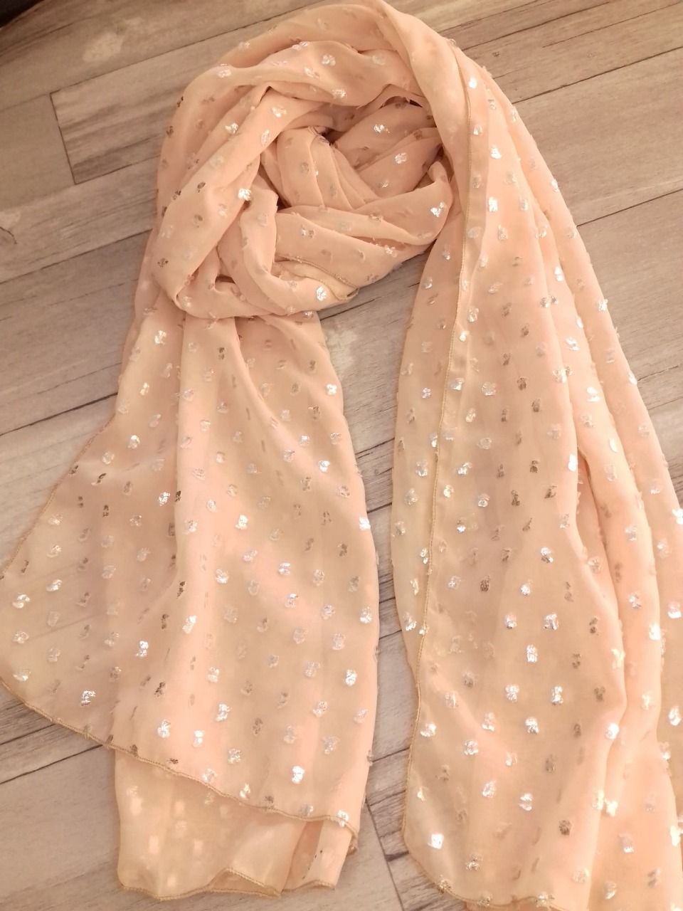 ⇢ En polyester beige rosé avec des plumetis argentés en relief; surjet roulotté beige assorti sur tout le tour du foulard