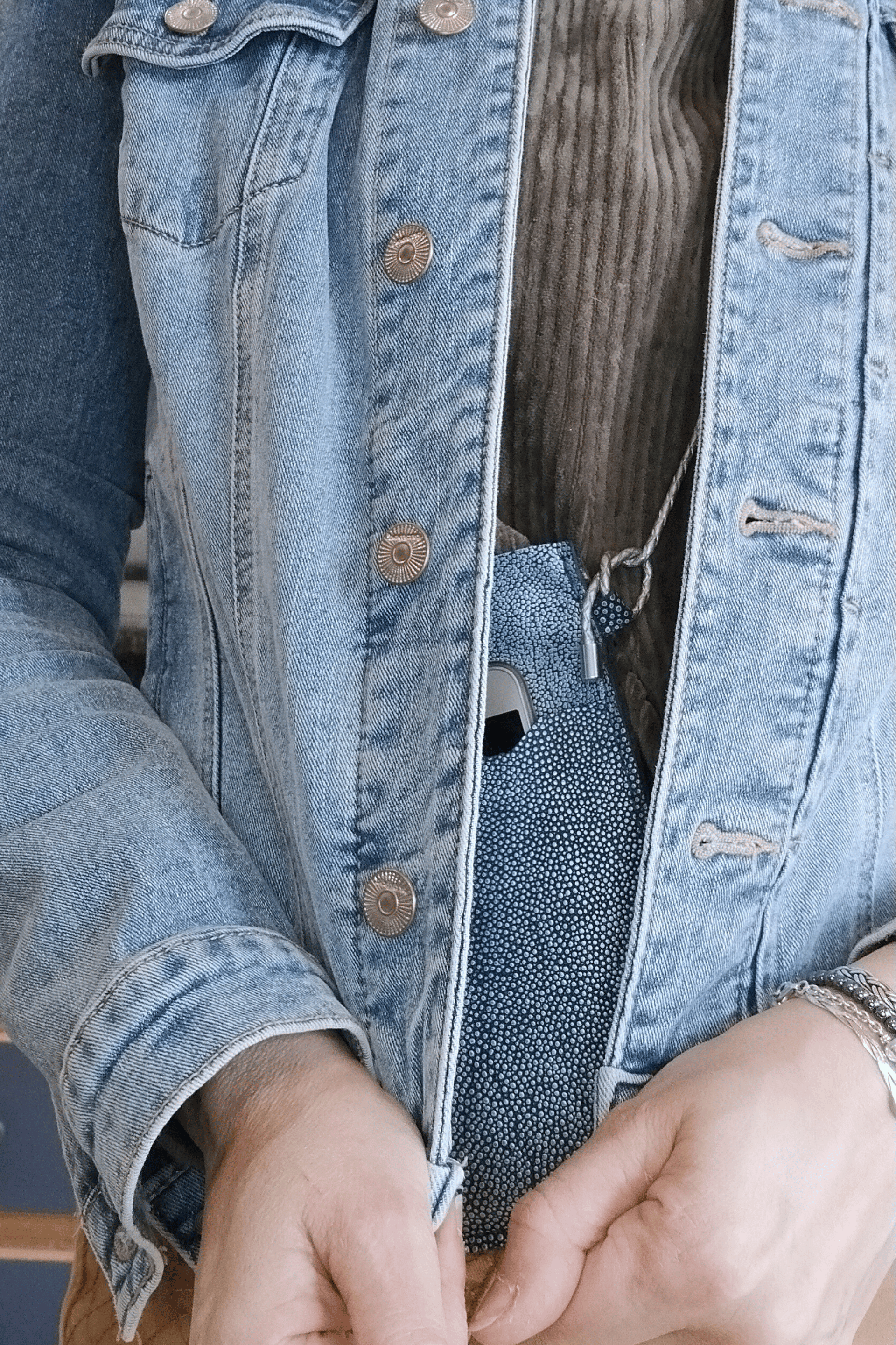 Cette pochette à portable est un must-have unisexe de votre dressing. Compagnon idéal de vos virées en ville, soirées et bodegas. Il contient évidemment votre téléphone, mais la poche centrale peut contenir en plus un petit portefeuille ou simplement des billets et une carte bancaire. L’ensemble est sécurisé grâce à la lanière centrale qui se ferme avec une pression métallique. Caché sous une veste, il est également le compagnon idéal en voyage, pour éviter les pickpockets