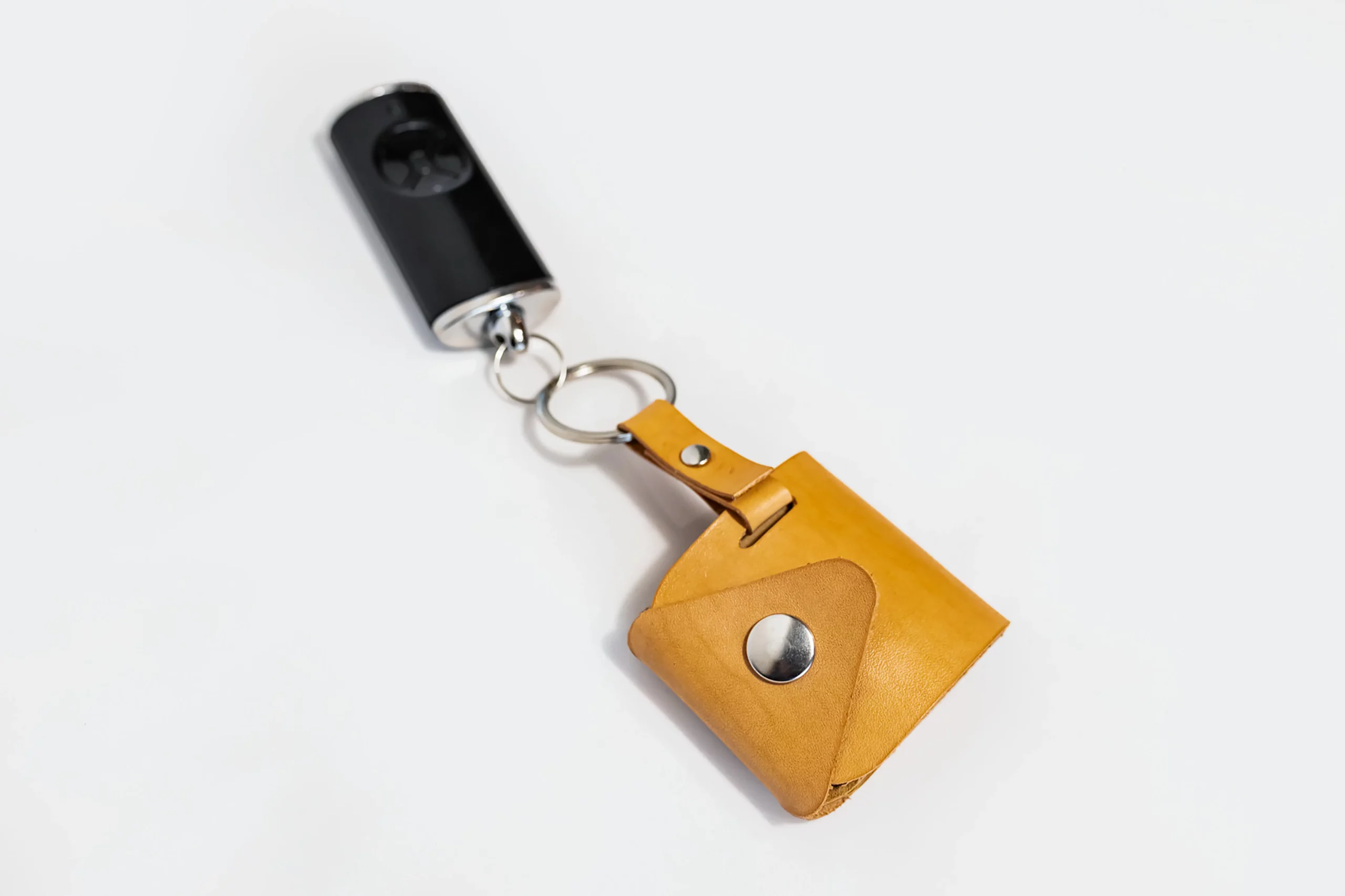 Entièrement réalisé à la main en cuir naturel, il abrite quatre photos au format 4 × 4,5 cm, protégées par un rabat qui se referme grâce à une pression métallique argentée, assortie à son anneau.