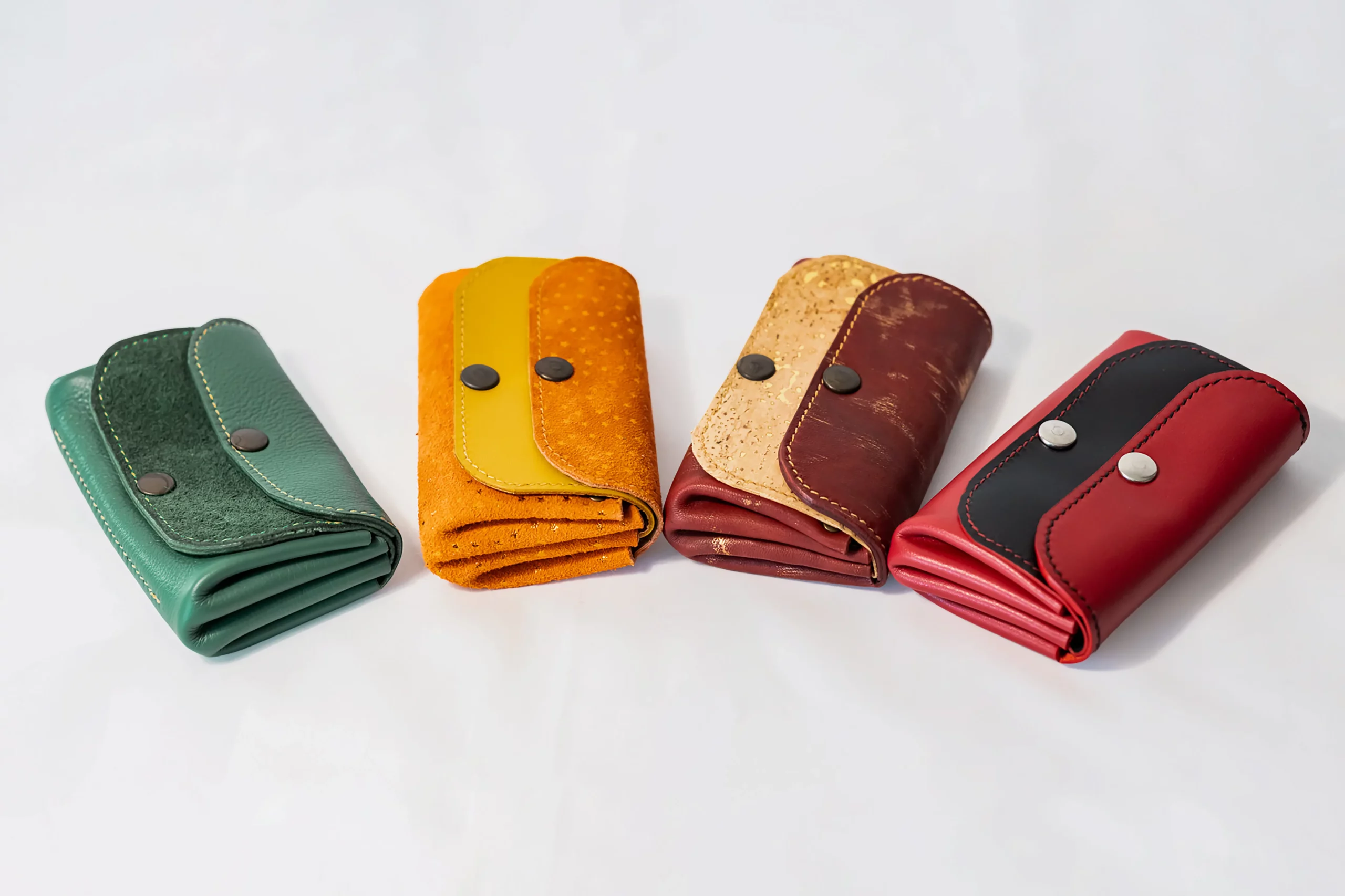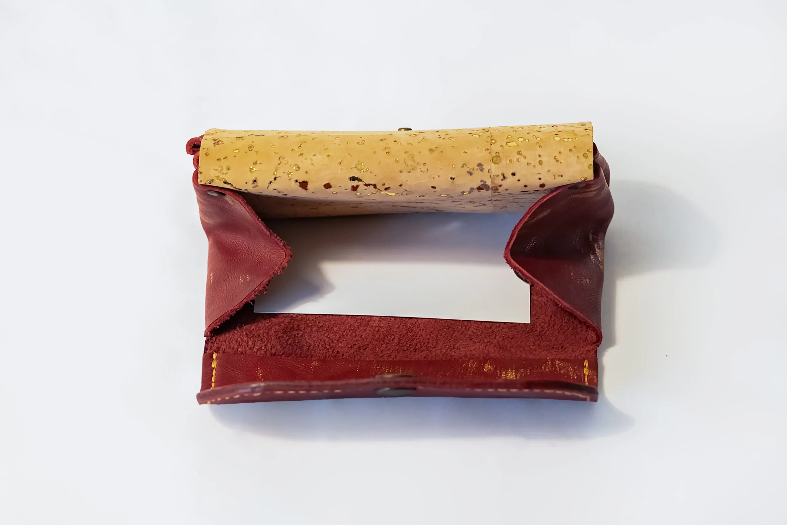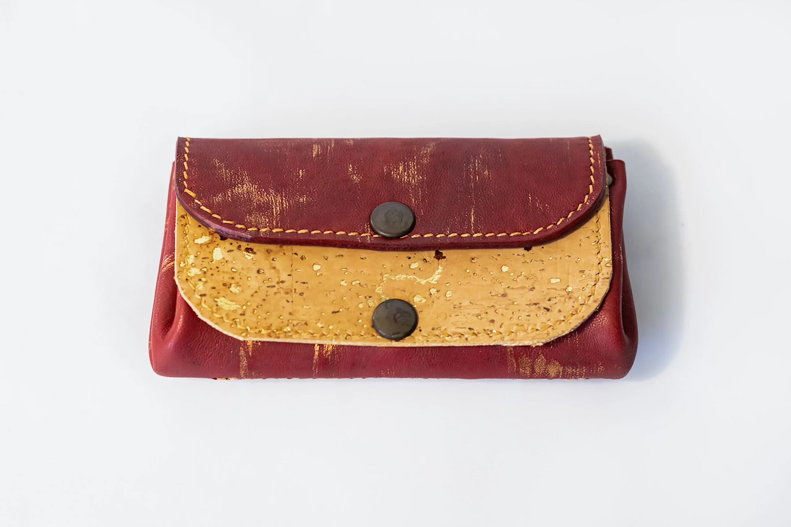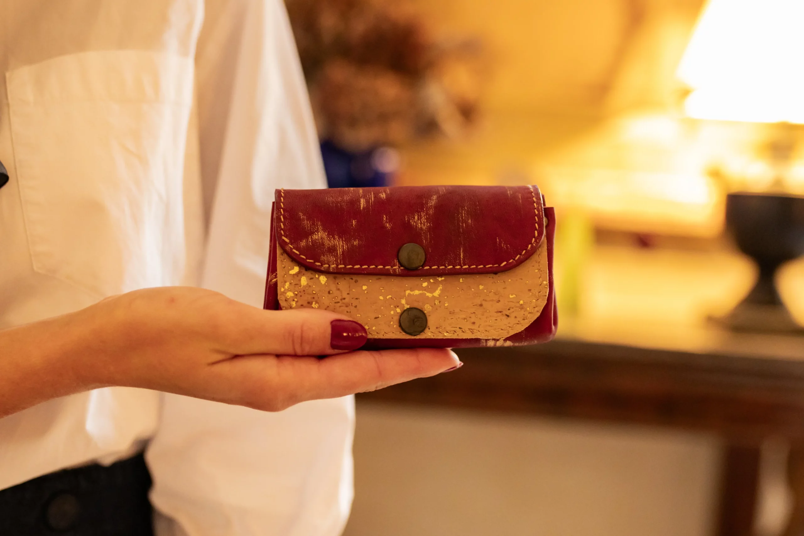 • Porte-monnaie artisanal en cuir de vache bordeaux avec des éclats dorés et rabat en liège naturel avec des éclats dorés