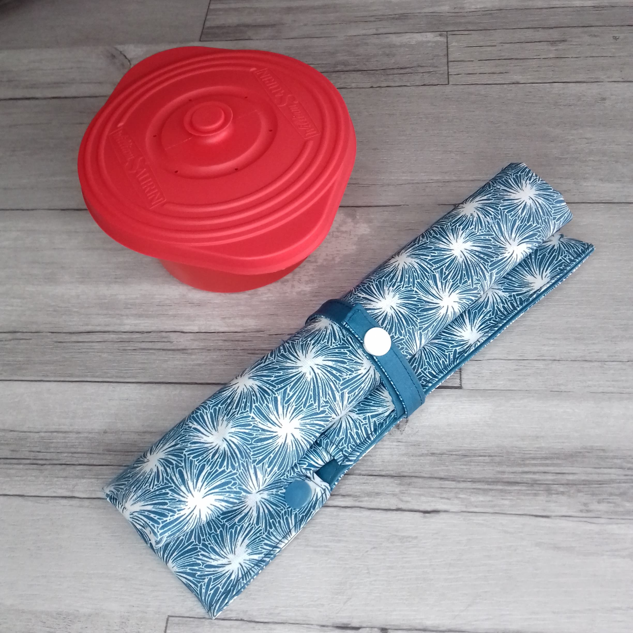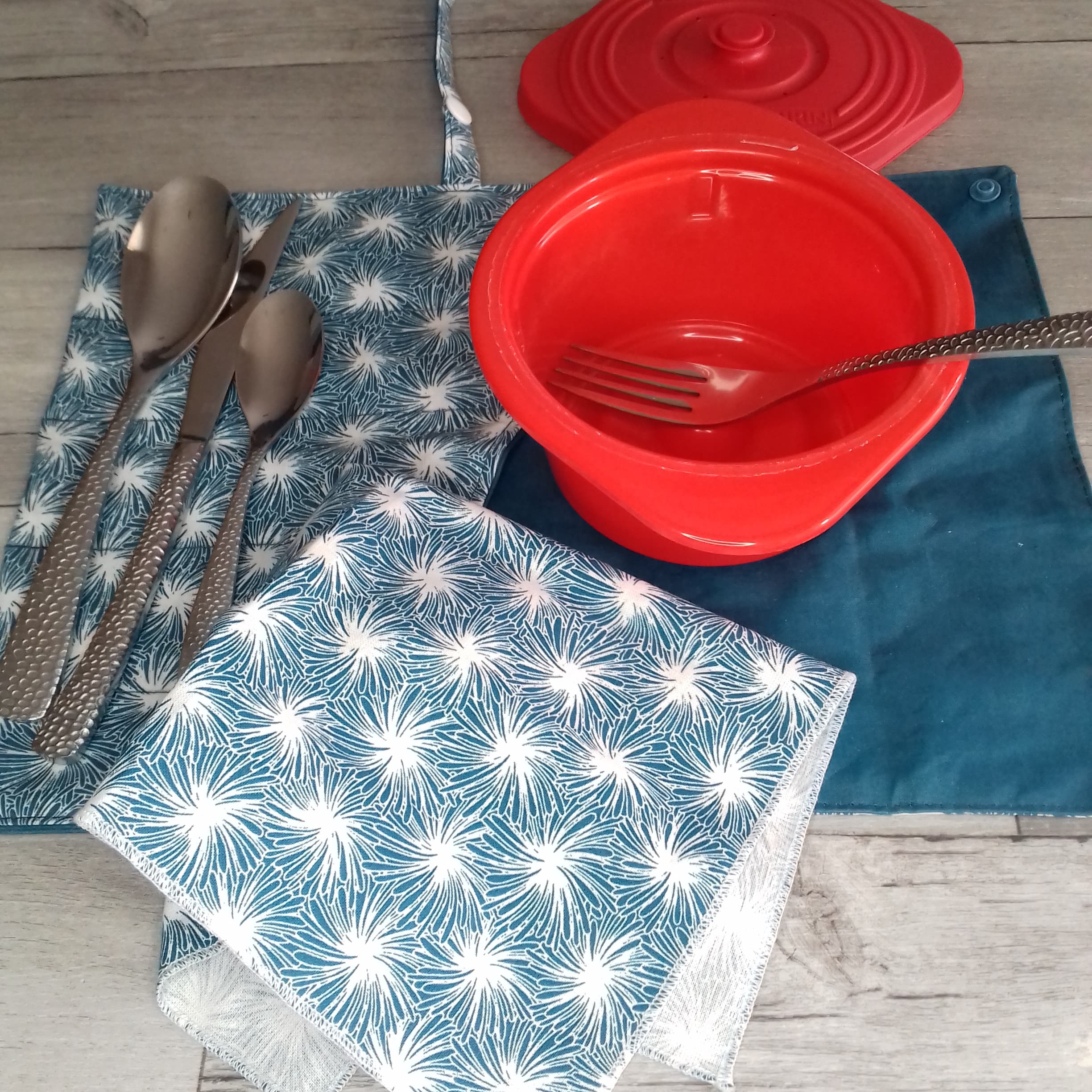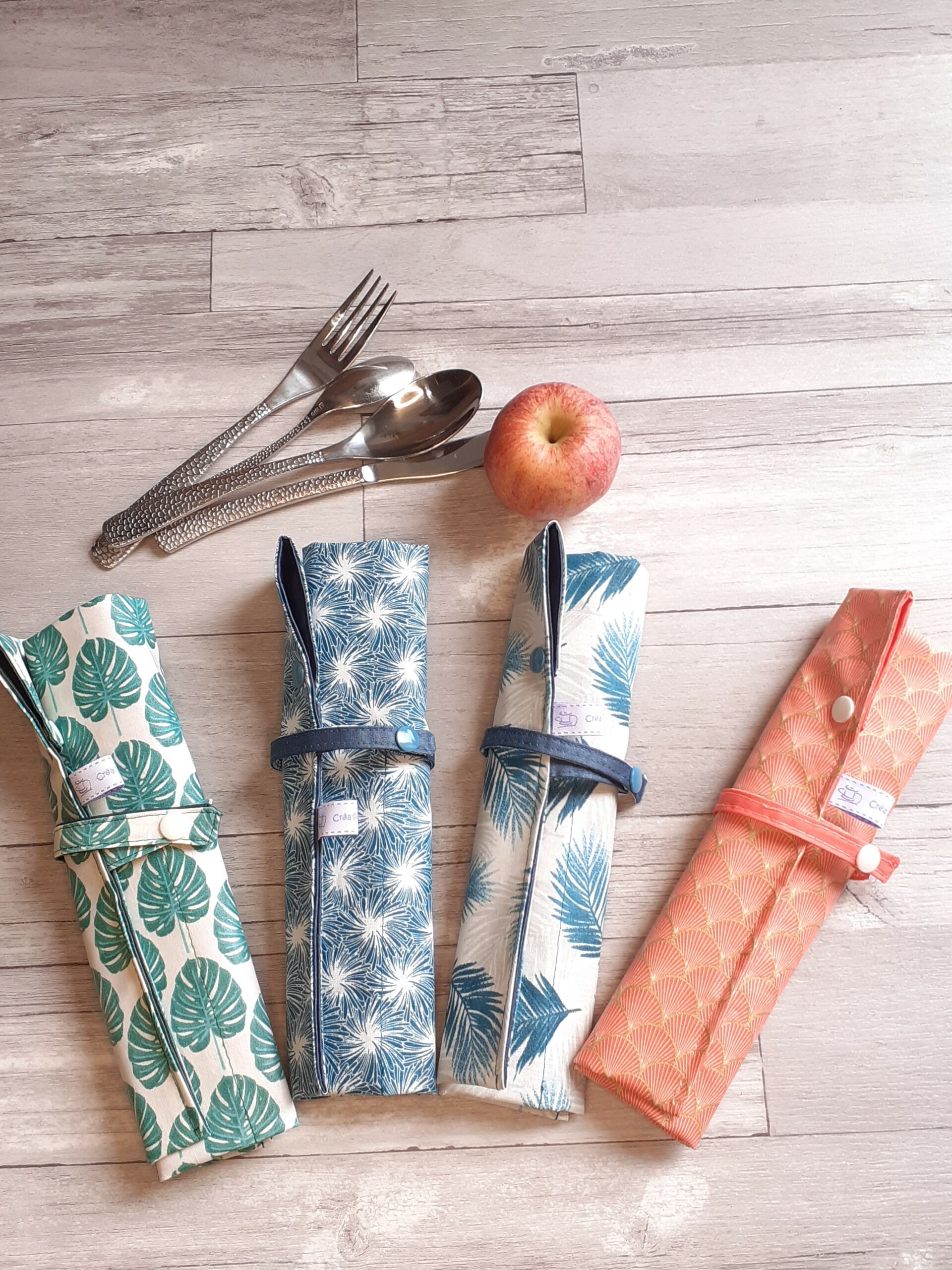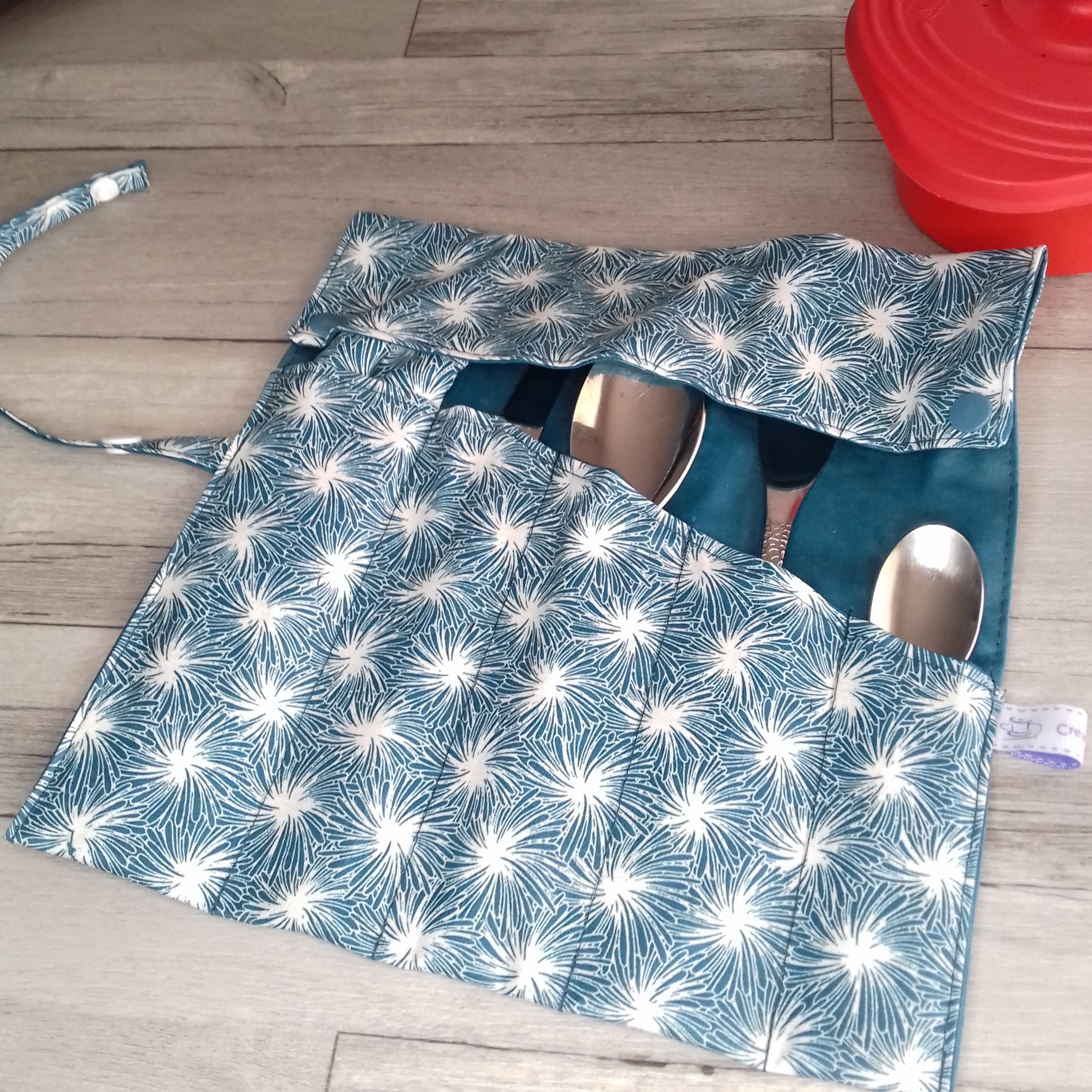 Le range-couvert nomade a un rabat à pression pour empêcher les couverts de glisser lors du transport. Une fois ouvert, il est suffisamment grand (mais pas trop ! ) pour vous servir de set de table et être sûr(e) de manger sur une surface propre. Il se ferme grâce à un lien avec pression en plastique, au coloris assorti au tissu.