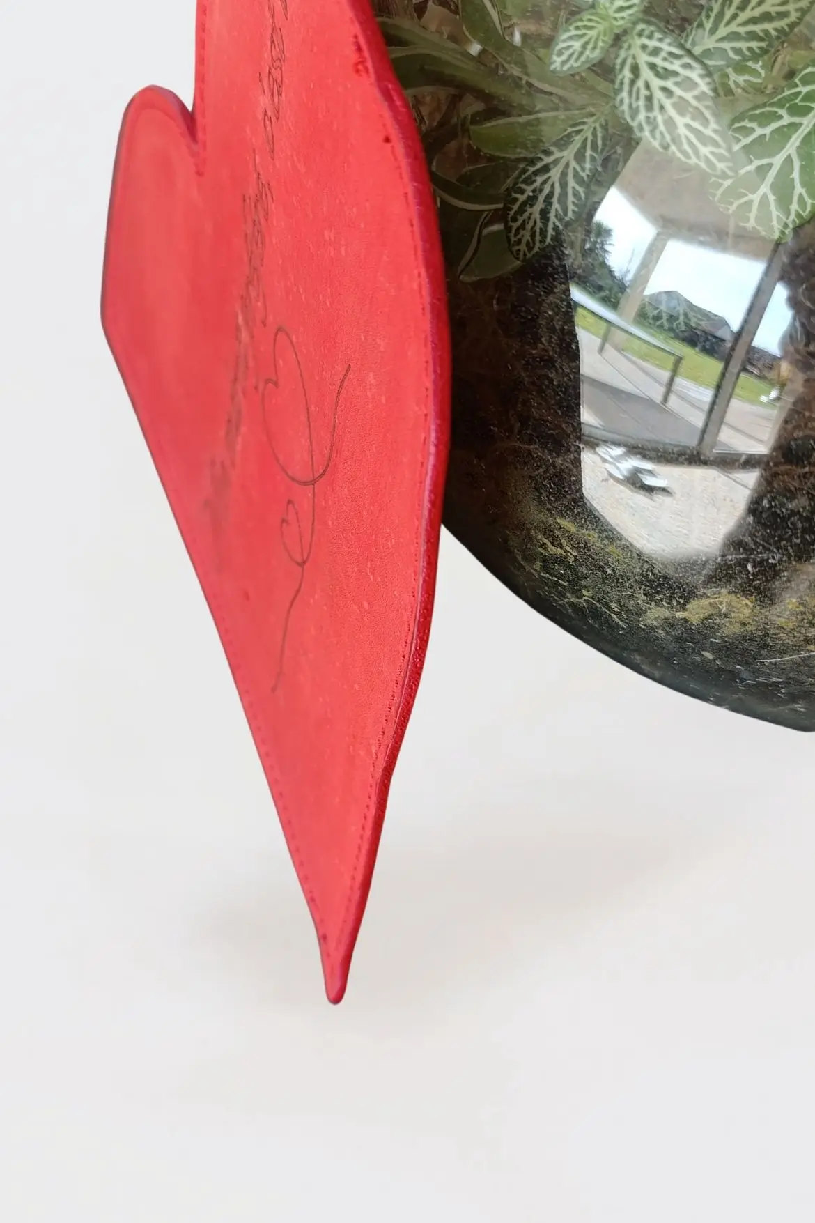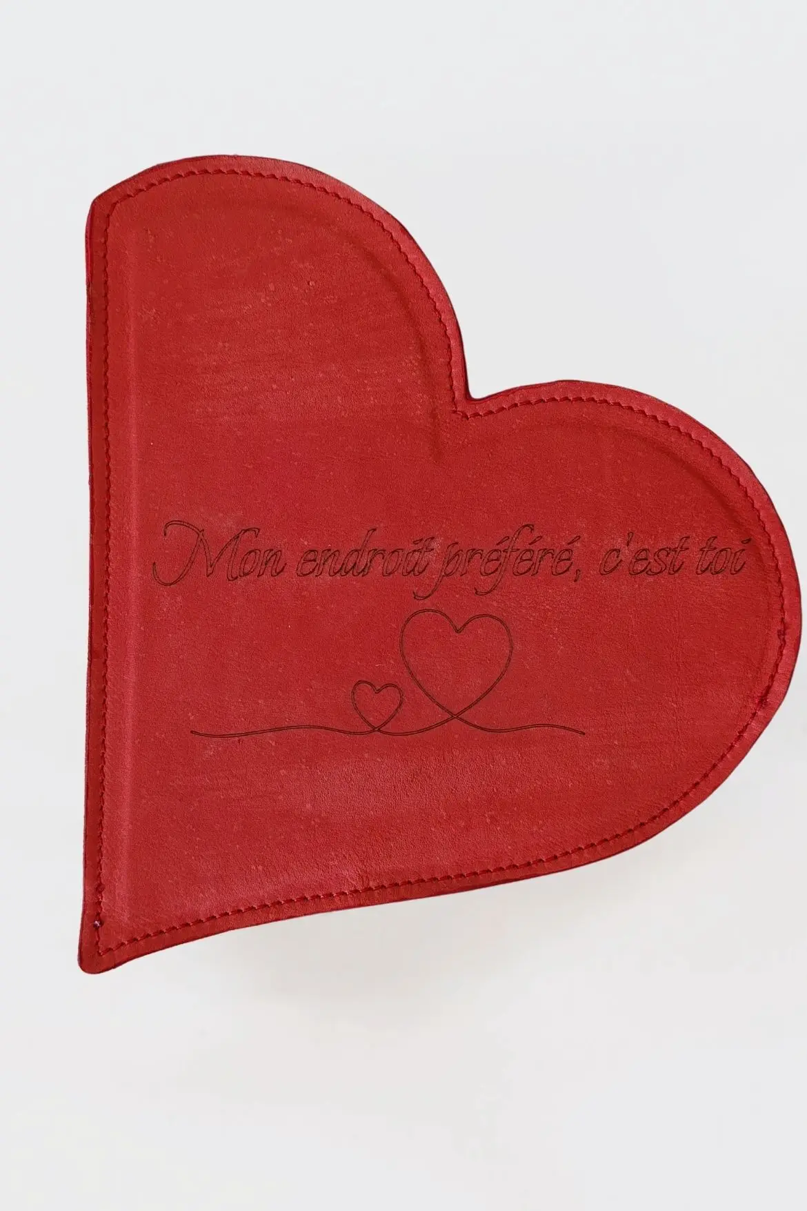 Tapis de souris en cuir rouge en forme de cœur, personnalisable avec un message d’amour. Un cadeau artisanal unique, fait main à Pau, élégant et durable-Pau de Cuir-Maroquinerie artisanaleTapis de souris cœur en cuir personnalisé – Message d’amour