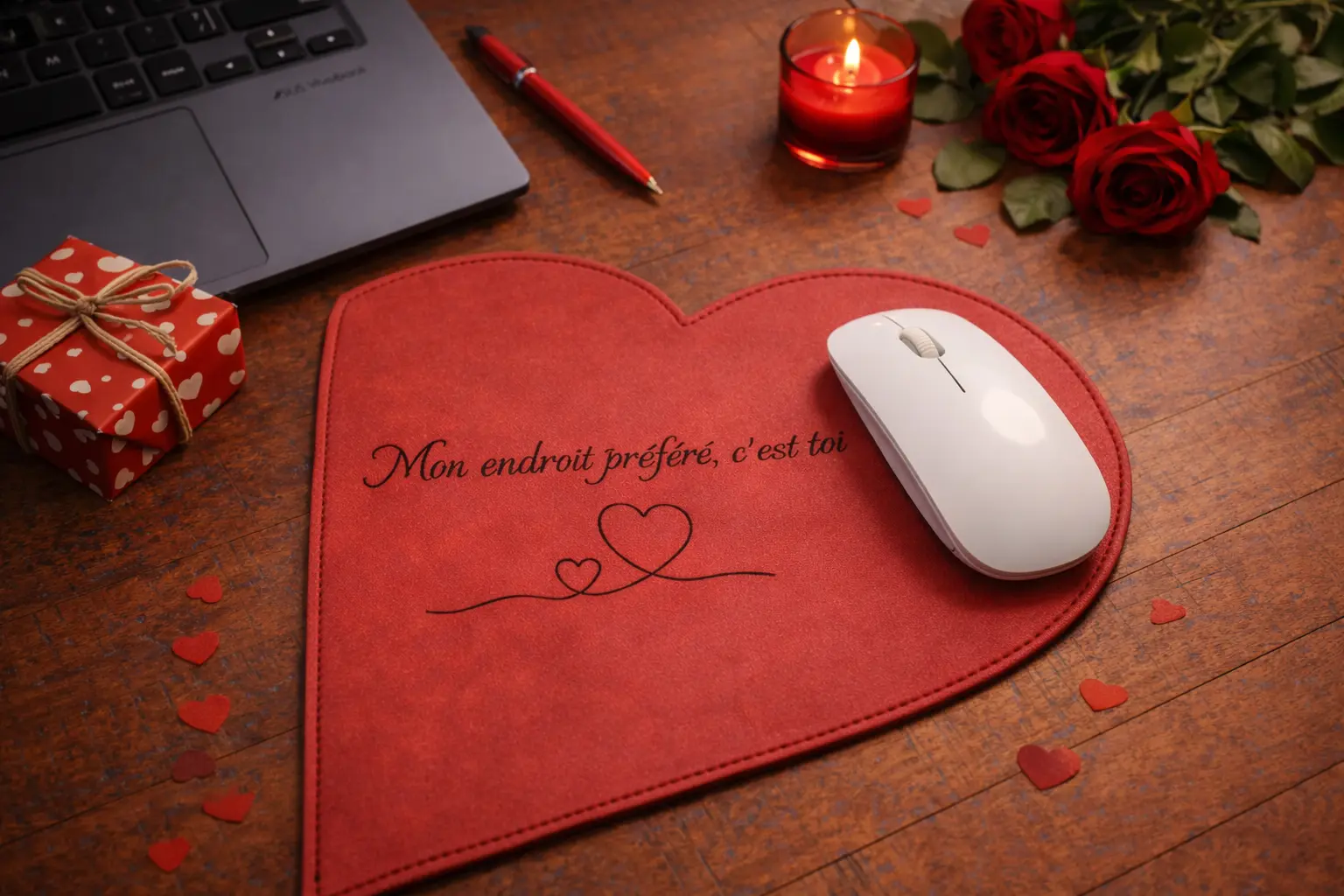 Ce tapis de souris en cuir rouge, en forme de cœur revisité, a été imaginé comme un cadeau d’amour, à la fois utile, élégant et chargé de sens.