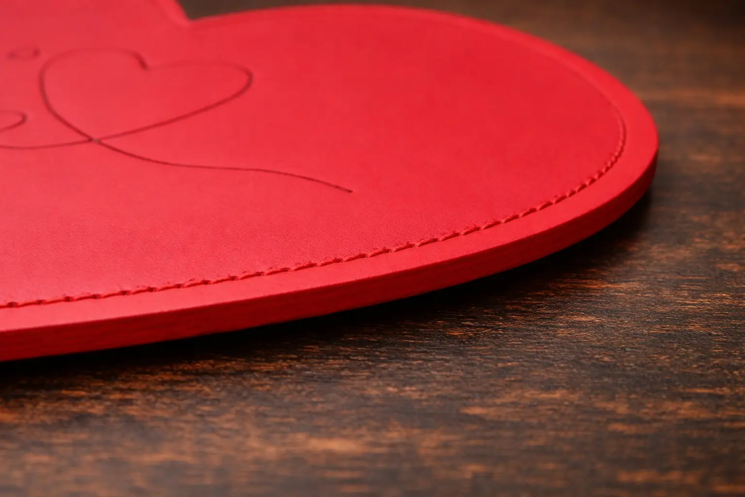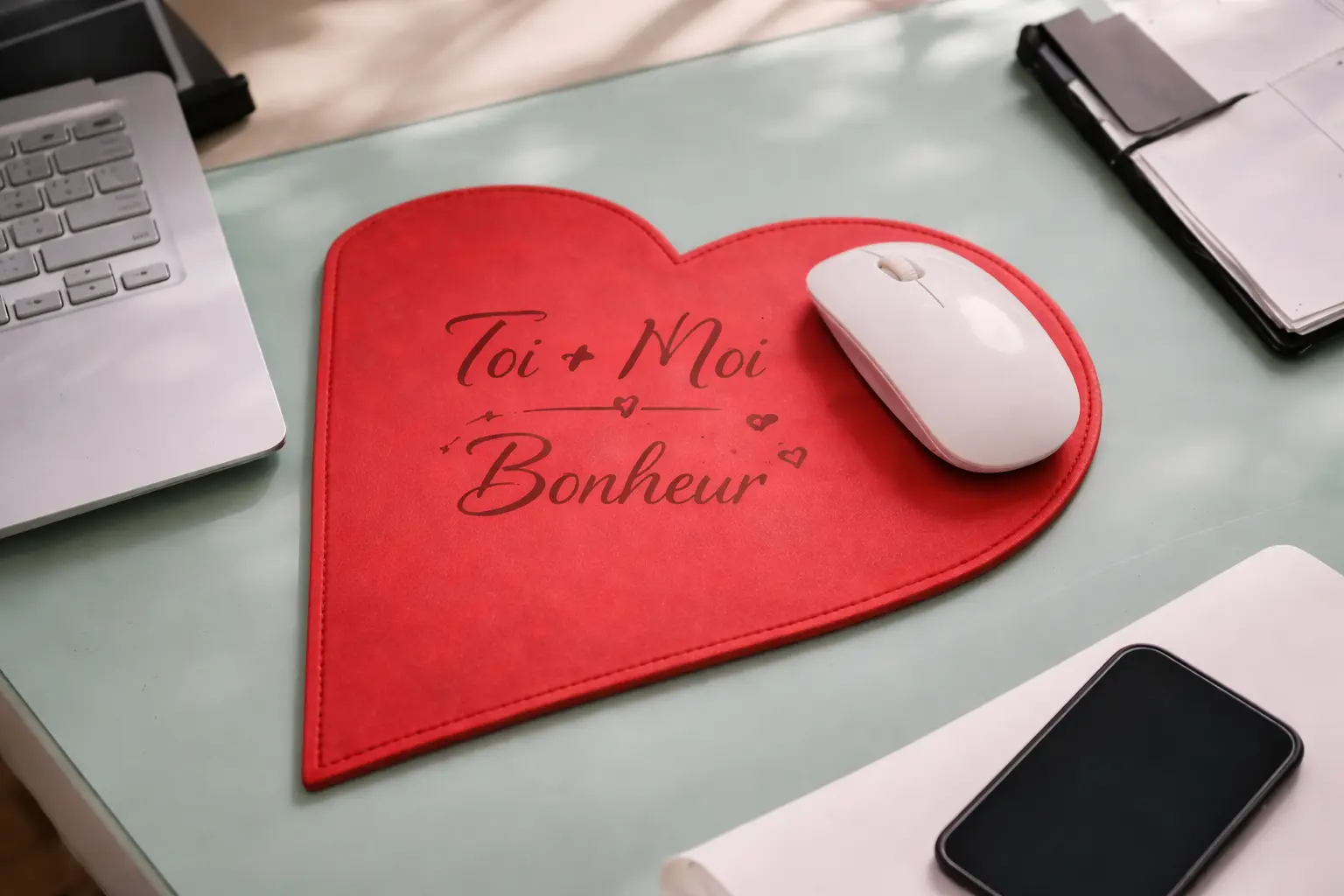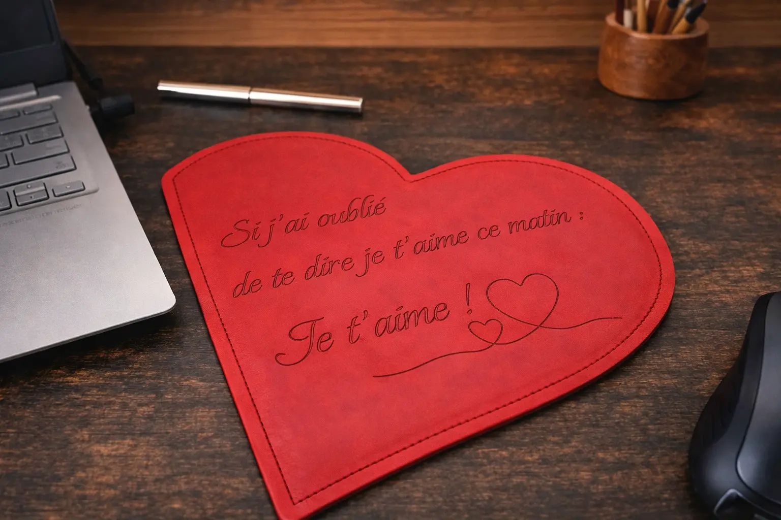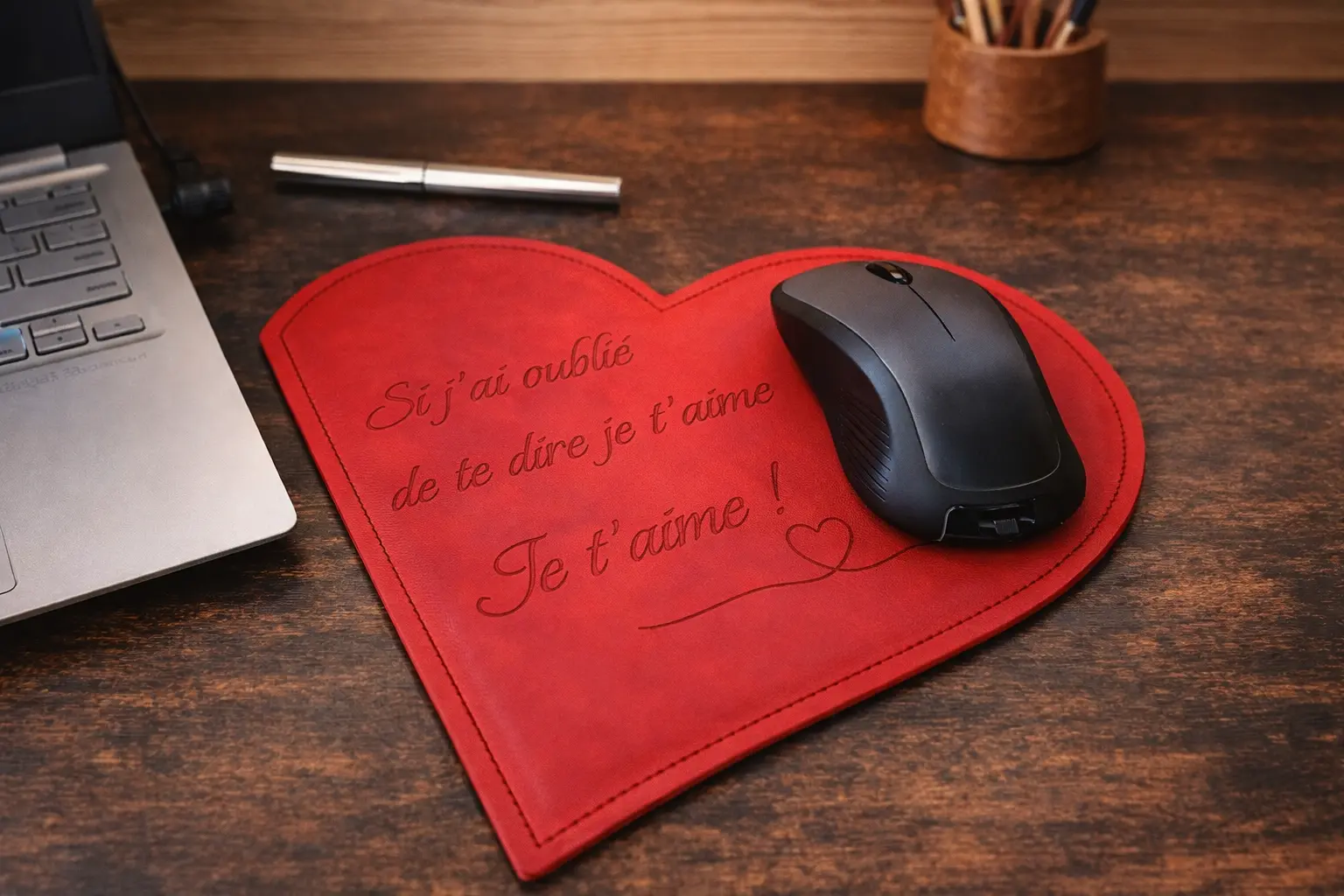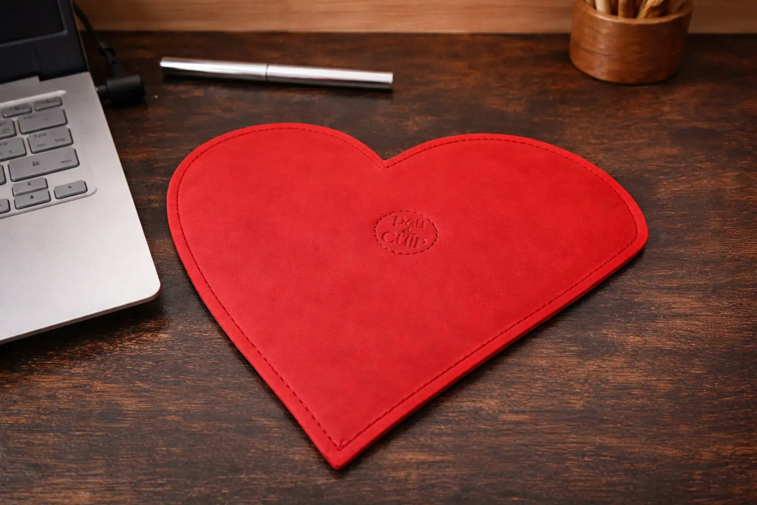 Ce tapis de souris en cuir en forme de cœur a été imaginé pour transformer un geste du quotidien en émotion durable.