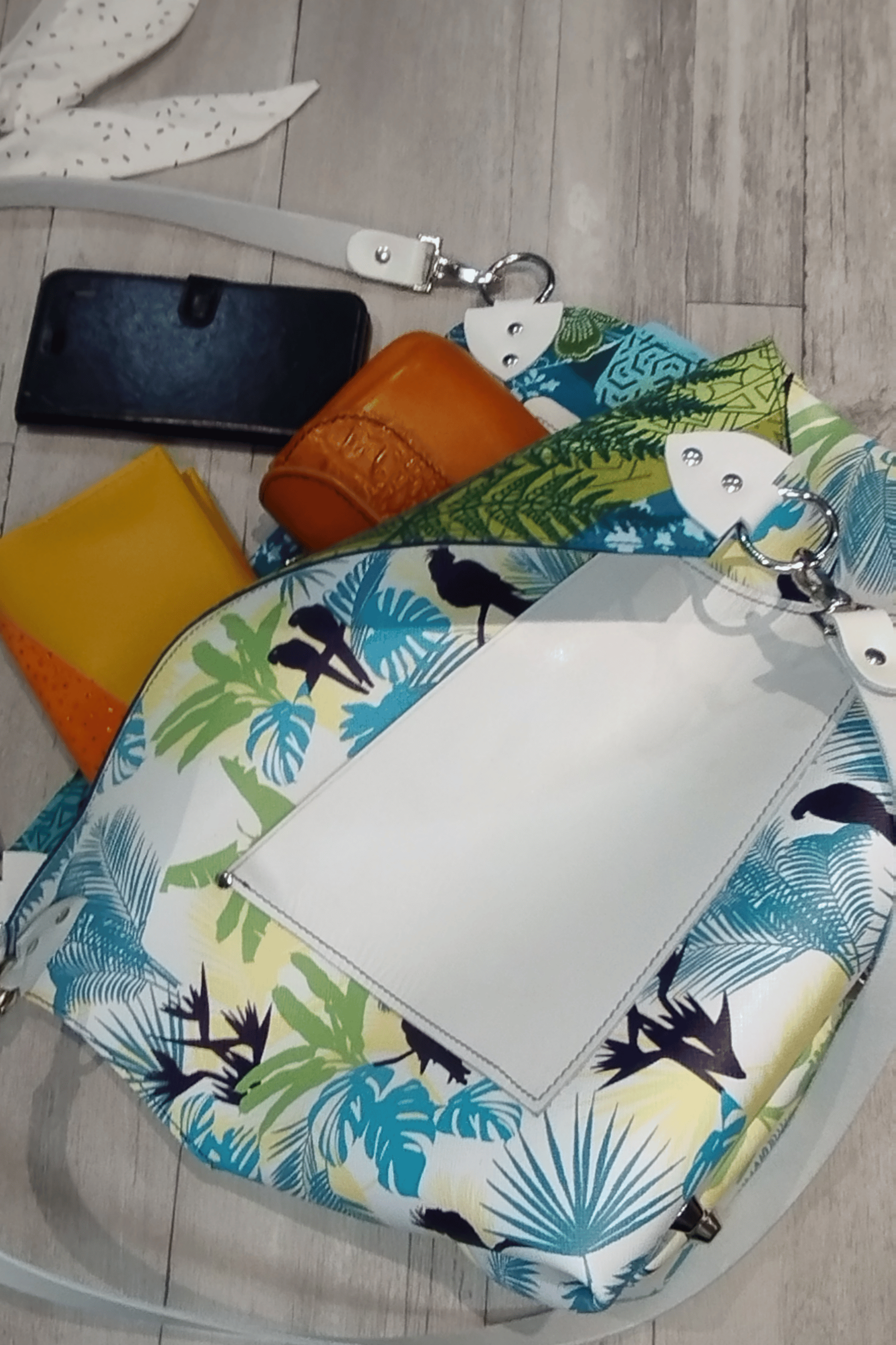 – Croute de cuir de vache, finition imprimé jungle et perroquets, origine Italie