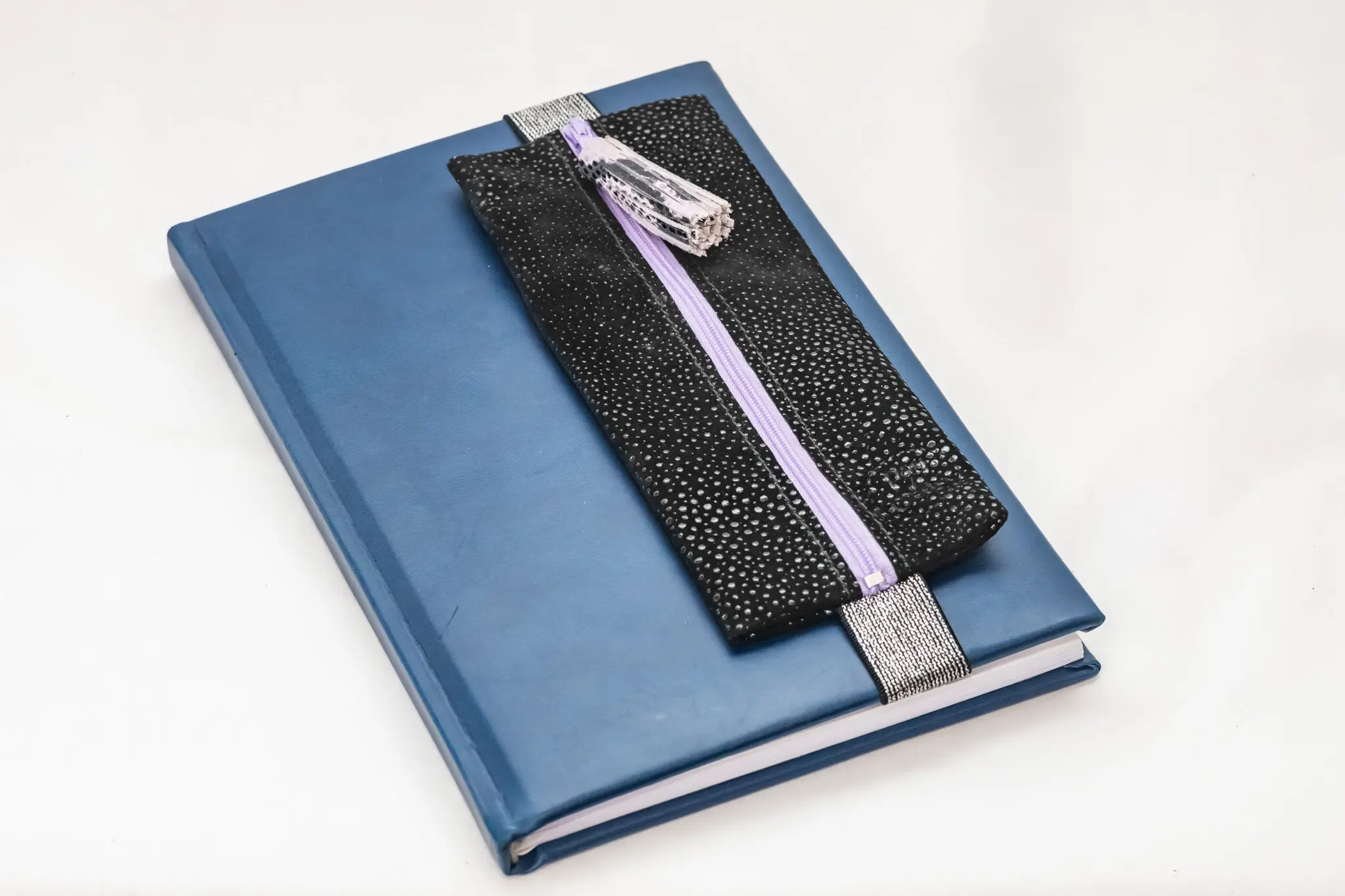 Trousse élastiquée noire avec fermeture éclair violette attachée à un agenda-Pau de Cuir-Pau-Maroquinerie artisanaleTrousse élastiquée noire spéciale carnet A5